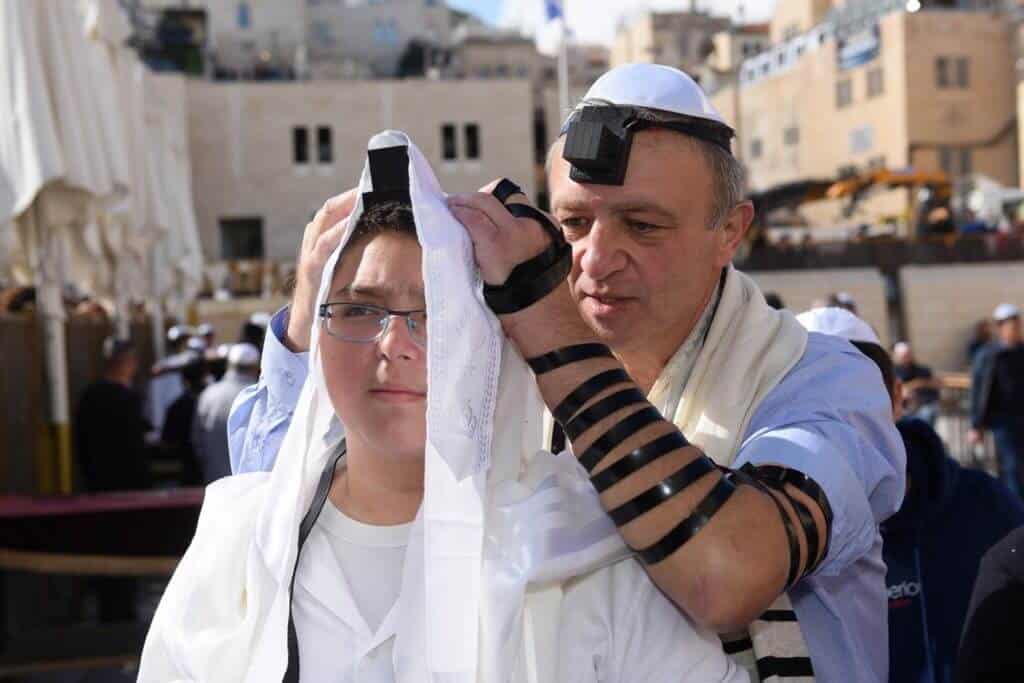 1. הנחת תפילין: המדריך מסייע לחתן הבר מצווה ומסביר על מהות המצווה.